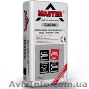 Смесь строительная сухая модифицированная цементно-песчаная «MASTER-CLASSIC» применяется снаружи и внутри зданий для штукатурных работ (толщина слоя до 20 мм); для устройства стяжек (100) по прочным основаниям, не деформируются (толщина слоя от 5 до 50 мм); для кладочных работ ...